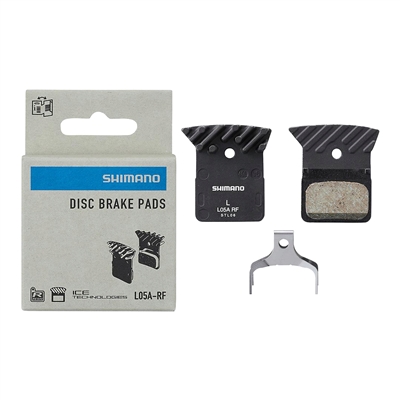 A pastilha de freio de resina L05A-RF da Shimano com aletas de refrigeração para freios a disco Dura Ace, Ultegra, 105 e GRX de 2 pistões tem melhor resistência ao desgaste do que os modelos anteriores. Com força de frenagem facilmente avaliável para uma frenagem suave e silenciosa.